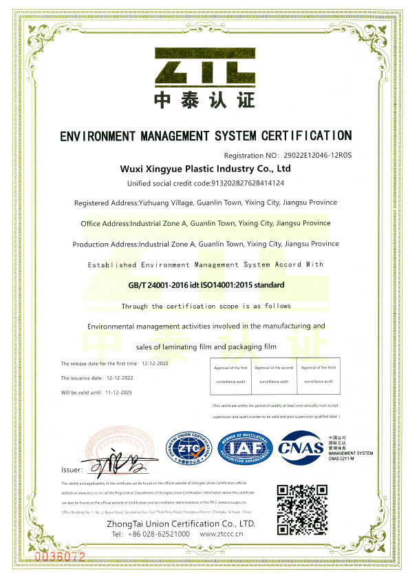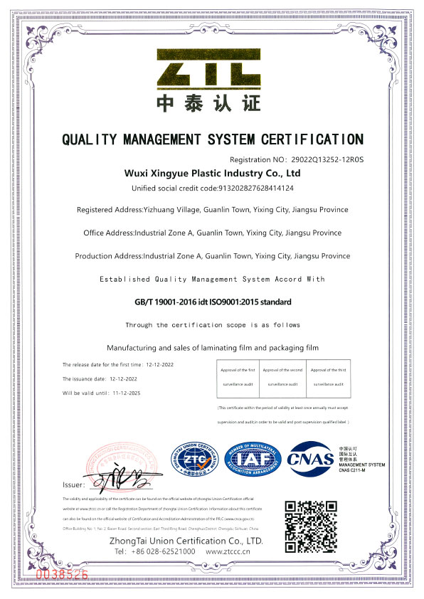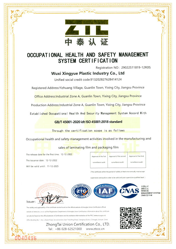 WUXI CITY XINGYUE PLASTIC CO., LTD. was founded in 2004,is a professional manufacturer of plastic laminating film. We has been identified as a high-tech enterprise by the local government.Our factory has successfully passed the SGS Gold supplier certification, and our products have passed the test of BV International Testing Company, which helps our company to better expand the overseas market and cooperate with the worlds first-class buyers.